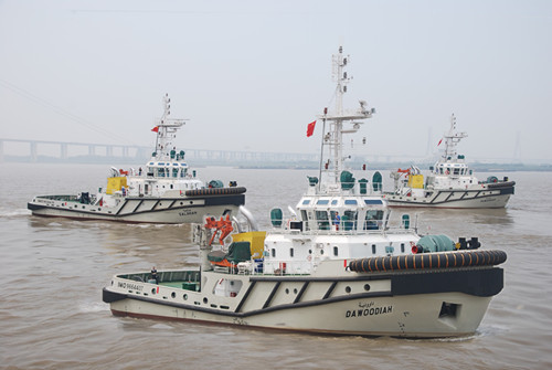 On the morning of 10th June 2014, three 55MT ASD tugboats were delivered to Middle-east Owner in Zhenjiang Shipyard, starting their sails smoothly. Their fleet can be seen from the above picture.