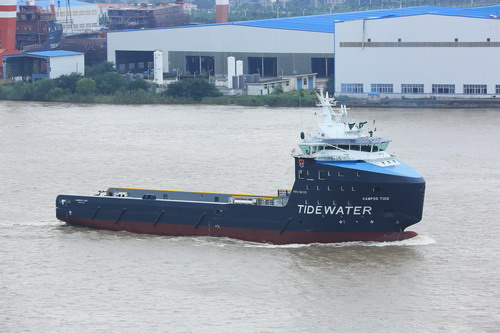 On 15th September 2014, China’s first Blue Drive Plus C ocean oil platform supply vessel VARD PSV08 named CAMPOS TIDE, which is from its six sister vessel lot, built for Tidewater Co., Ltd. USA, was successfully delivered in the builder’s place, Zhenjiang Shipyard.