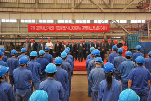 On the morning of June 12 2015, the steel cutting ceremony for 11000DWT self-unloading coal carrier was successfully launched. Leaders from Jiangsu Zhenjiang Shipyard (Group) Co., Ltd and Owner representatives attended the ceremony. The carrier will be under Korean KR class approval. |