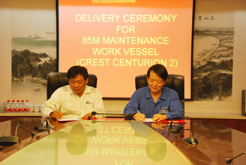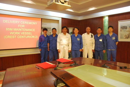 In the morning of 15th June 2016, another 85m Maintenance Work Vessel named CREST CENTURION 2 which is representing international advanced level in the world market had been conducted the delivery and acceptance ceremony in Zhenjiang Shipyard. This is the 3rd unit of 85m platform support vessel which was successfully delivered within one month. So far, Zhenjiang Shipyard had been successfully delivered all the series and various ocean engineering vessels since the Financial Crisis Broke Out at 2008.