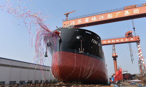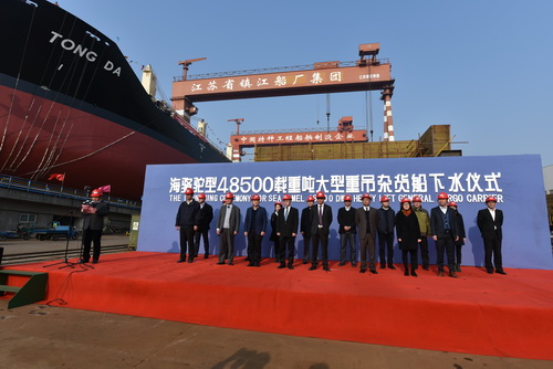 In the morning of November 22rd, 2017, the second sea camel type 48500DWT heavy lift general cargo carrier in the world, which was funded jointly by SUMEC MARINE CO.,LTD and Topsheen Shipping Group Limited, has been launched successfully in Jiangsu Zhenjiang Shipyard (Group) Co.,LTD. |